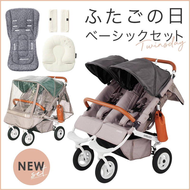 新生児から使えるエアバギーCOCOダブルEXフロムバースとベビーカーまくら、ベビーカーマット、ストローラーカバー、ハンドルカバーがセットになった【直営オンラインストア限定】ふたごの日セットです。
