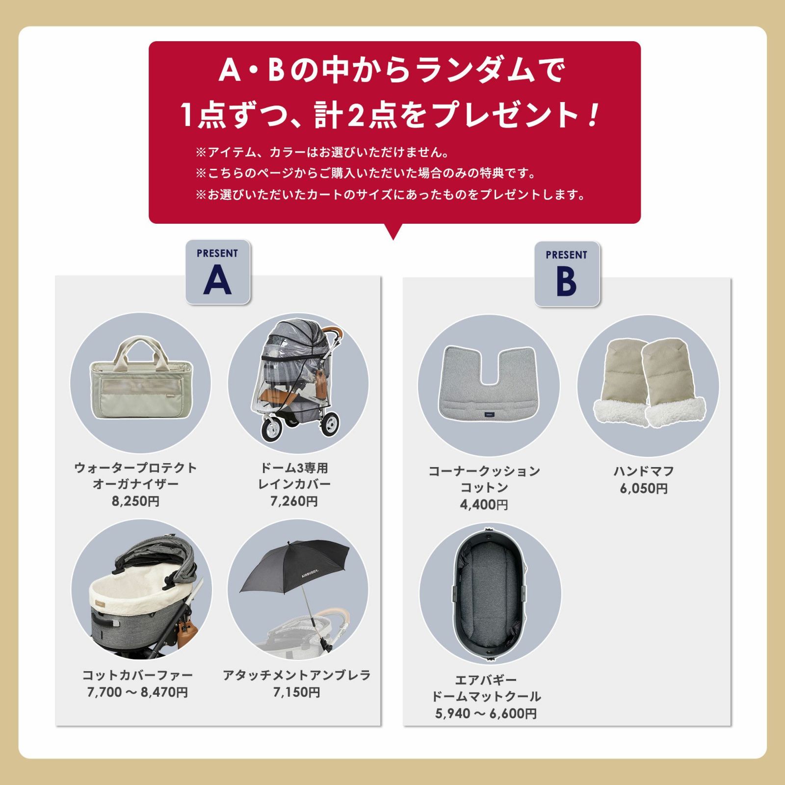他の画像を見る お気に入りに登録する PET \エアバギー公式オンラインストア限定/ エアバギー ドーム3 + 純正オプションプレゼント 福袋 ¥ 72,600 税込 販売開始前です。 販売期間 2025/12/06 12:00 〜 2025/12/21 23:59 在庫切れ