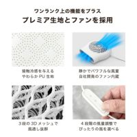 マットに内蔵されたファンからの風が3Dメッシュ構造を通じて全面に広がり、カートや車内の熱気を逃します。