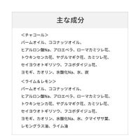 パームオイル、ココナッツオイル、 ヒアルロン酸Na、アロエベラ、ローマカミツレ花、 トウキンセンカ花、ヤグルマギク花、カミツレ花、 セイヨウオトギリソウ、フユボダイジュ花、 ヨモギ、カオリン、水酸化Na、水、炭