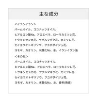 パームオイル、ココナッツオイル、 ヒアルロン酸Na、アロエベラ、ローマカミツレ花、 トウキンセンカ花、ヤグルマギク花、カミツレ花、 セイヨウオトギリソウ、フユボダイジュ花、 ヨモギ、カオリン、水酸化Na、水、 イランイラン油