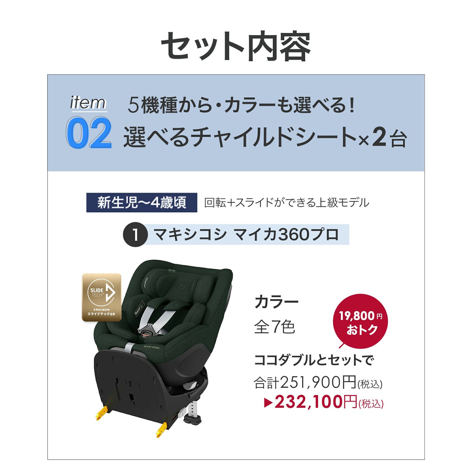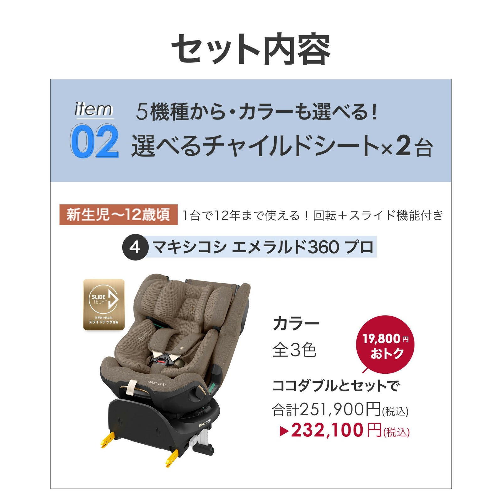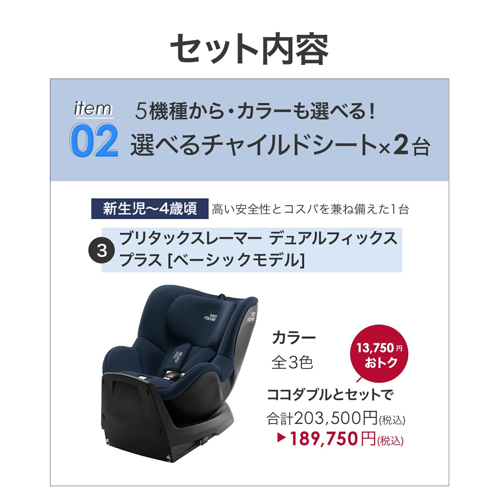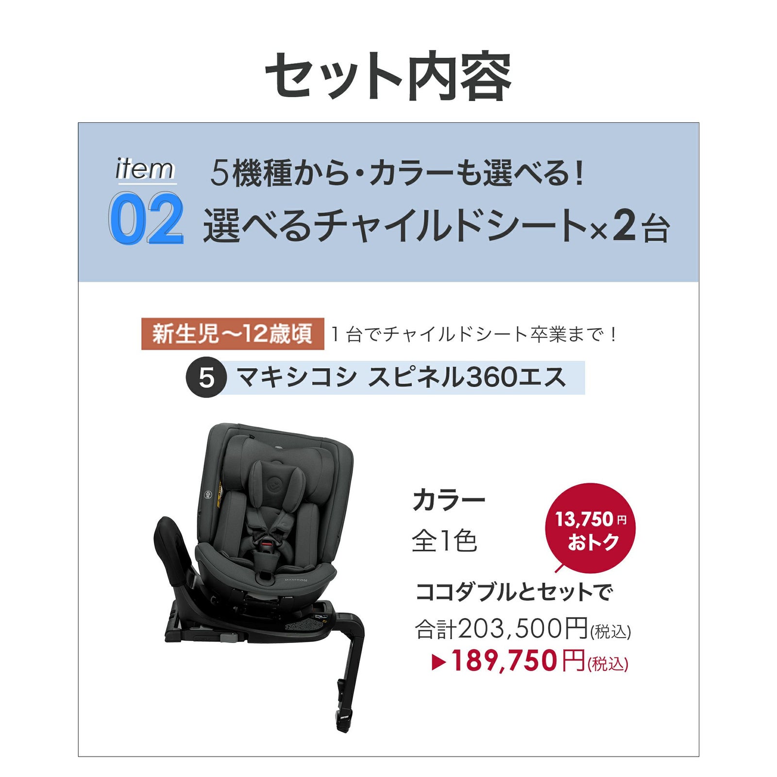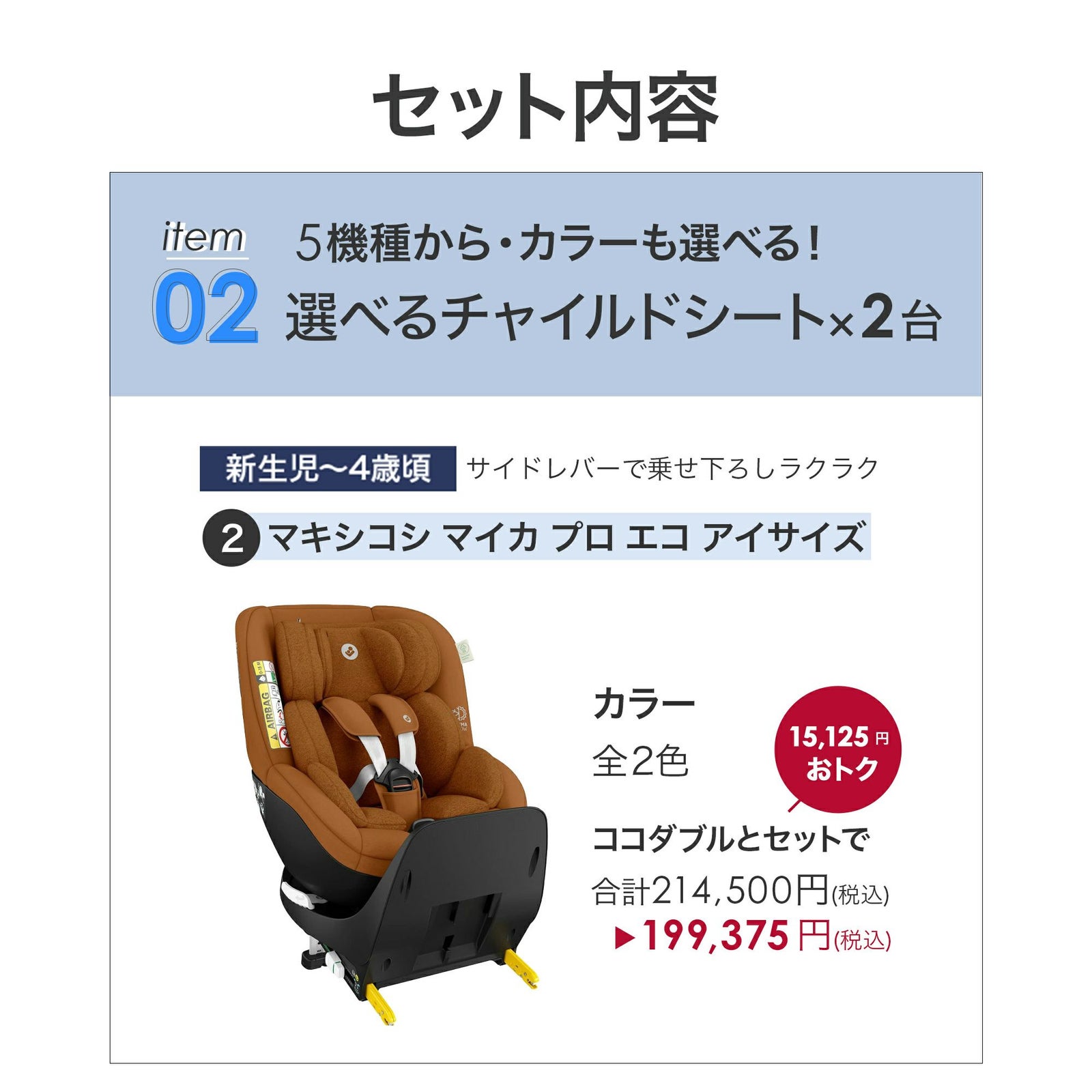 他の画像を見る お気に入りに登録する BABY お得セット チャイルドシート2台目25%OFF ふたごの日 ココダブルセット [チャイルドシート] ¥ 189,750 税込 〜 ¥ 税込 販売開始前です。 販売期間 2026/02/17 0:00 〜 2026/02/28 23:59